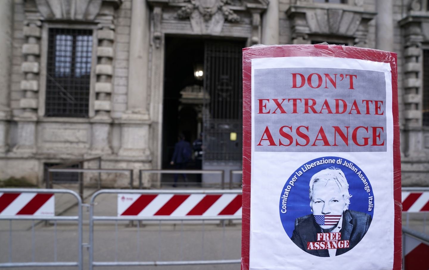 A banner against the extradition of Julian Assange to the United States is displayed in Milan, Italy, on March 11, 2024. (Pier Marco Tacca / Getty Images)