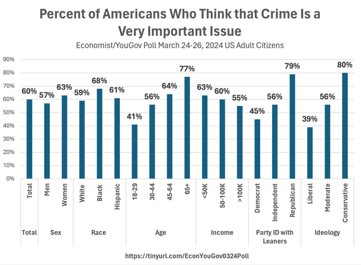 A new Economist/YouGov poll confirms what we have seen before in surveys: high income people as well as liberals and Democrats are the least concerned about crime, though other surveys also show that those with a graduate school education are also the least concerned. Interestingly, while Democrats and liberals are least concerned about crime, women and blacks, two of their strongest constituents, are most concerned.