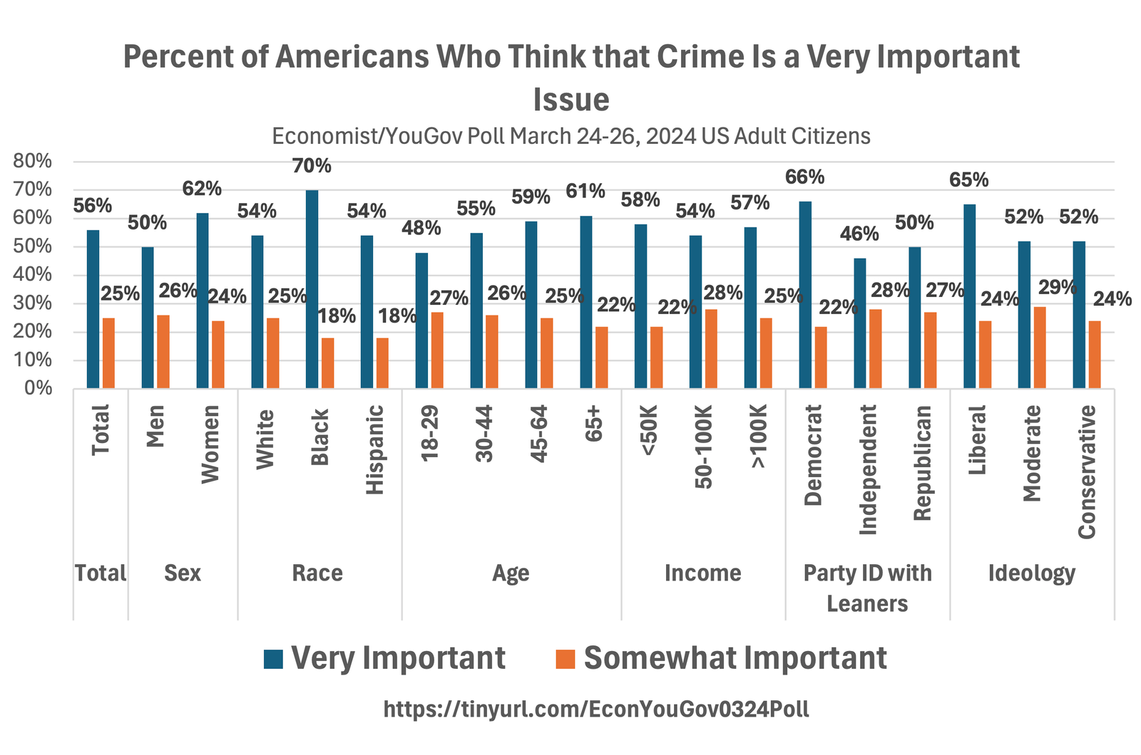Asking whether “guns” are an important issue for Americans is not particularly useful as both those concerned about the right to self-defense and gun control advocates may both answer yes. While a new Economist/YouGov poll (p. 36) from March 24-26, 2024 has guns and civil rights tied at 6% of USA adults saying that it is the most important issue facing the country, a range of other issues (taxes and government spending, abortion, and national security) come in at a very close 5%. The fact that both those concerned about the right to self-defense and gun control advocates will answer “yes” to this question can be seen by the very high rates that various groups with widely differing views on guns answer that it is important.