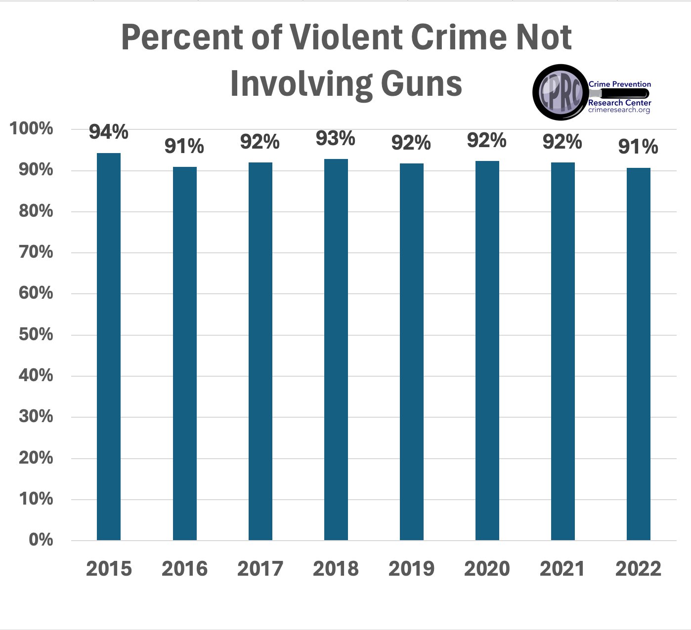 Over the eight years from 2015 to 2022, 92.1% of violent crime over that period of time didn’t involve guns. Violent crime is much broader than firearms. Despite President Biden continually referring to violent crime as a gun problem, that is clearly not the case.
