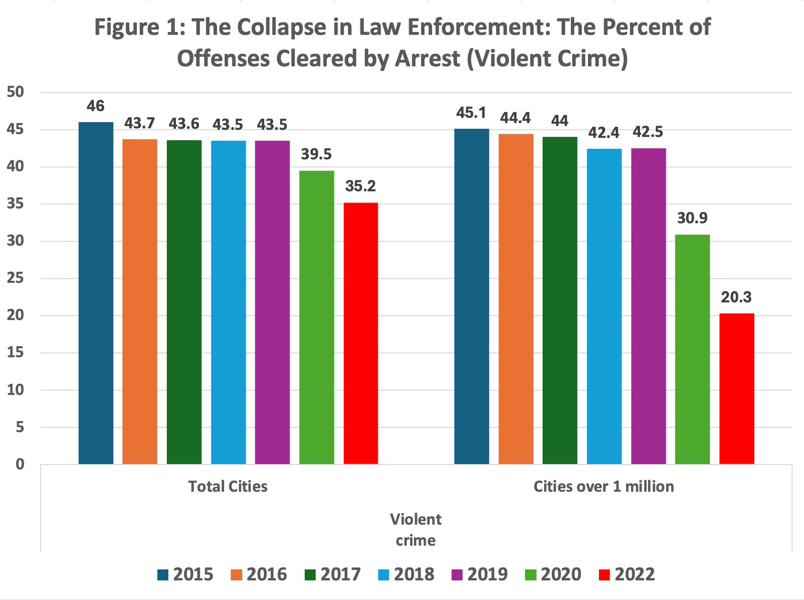 But, there is a big problem with using the FBI Uniform Crime Report data on crimes reported to police because victims don’t report most crimes. More importantly, the number of crimes reported to police falls as the arrest rate declines. If people don’t think the police will solve their cases, they are less likely to report them to the police. While the violent crime rate reported to police fell by 1.7% between 2021 and 2022, the National Crime Victimization Survey shows that total violent crime (reported and non-reported) rose from 16.5 to 23.5 per 100,000. Violent crime in 2022 was above the rate the last year before the pandemic in 2019 and above the average for the five years from 2015 to 2019.