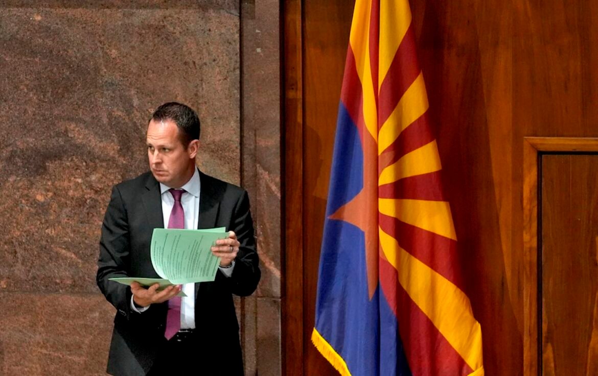 CORRECTS NAME: Arizona Rep.Travis Grantham, R, looks over documents from the House floor at the Capitol, Wednesday, April 10, 2024, in Phoenix.