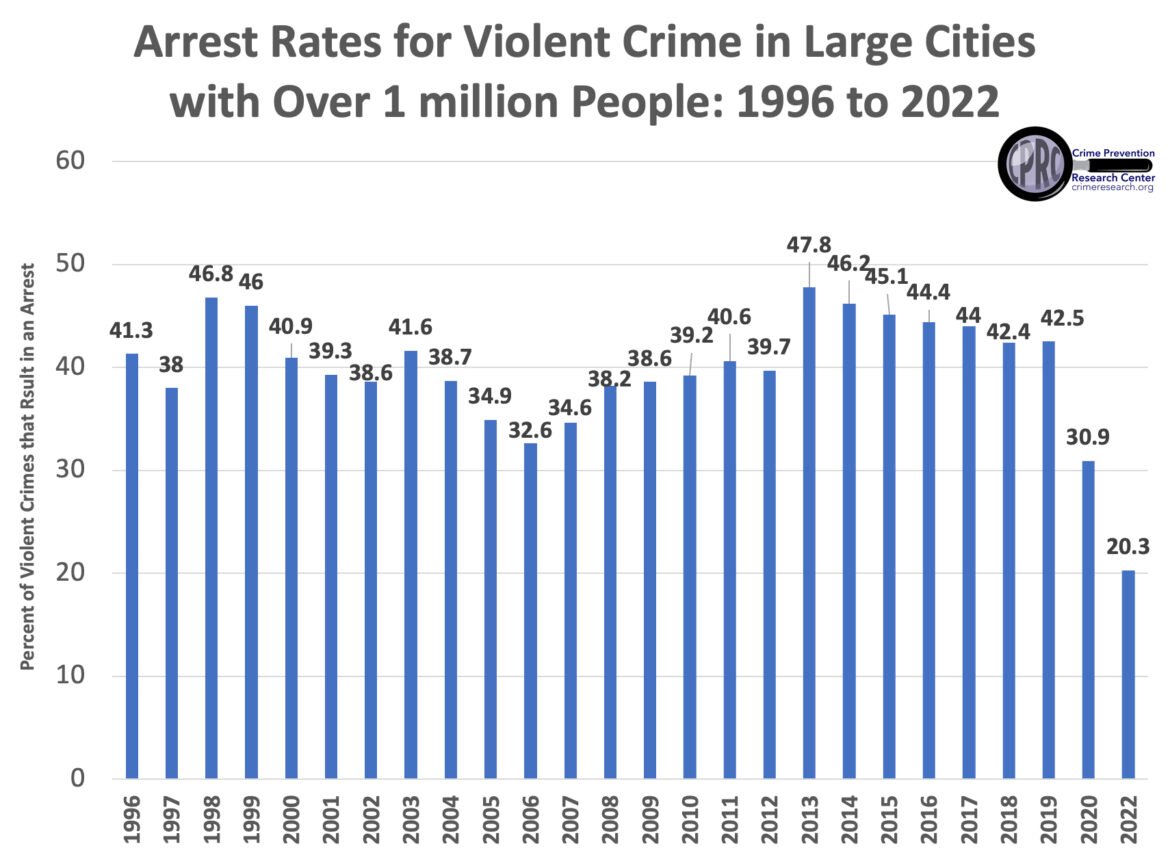 The drop in arrest rates over the last few years from 2020 to 2022 is without precedent, and that is particularly true for the largest cities. For cities with over 1 million people, the average arrest rate for reported violent crime fell from an average of 41% in the 25 years from 1996 to 2021 to 20.3% — a 50% drop. The lowest arrest rate in the preceding 24 years before COVID, between 1996 and 2019, was 32.6%. The arrest rate in 2022 was still 38% lower than the previous low rate.