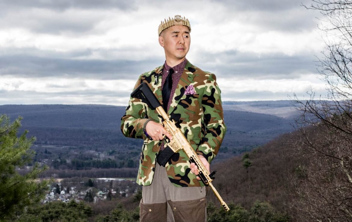The Rev. Hyung Jin “Sean” Moon poses for a portrait with his gold AR-15 at Moon’s home in Matamoras, Pennsylvania, on April 26, 2018.