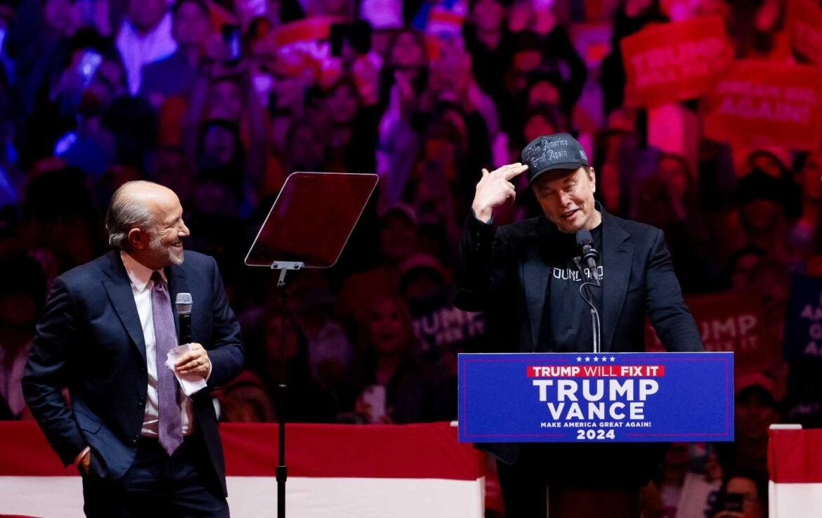 Howard Lutnick, chairman and chief executive officer of Cantor Fitzgerald LP (left) and Elon Musk during a campaign event with Donald Trump at Madison Square Garden on October 27, 2024.