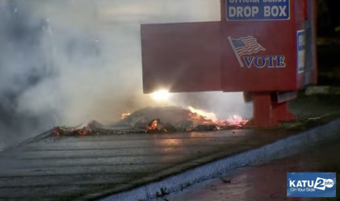 Here is a video from Portland’s KATU TV about a ballot drop box set on fire in Clark Count, Washington. Hundreds of ballots were reportedly destroyed. The Vancouver Police Department reports that another ballot box was set on fire on Monday morning in nearby Vancouver, Washington. The one in Vancouver is in Washington’s 3rd Congressional District, which is one of the most competitive races in the country.