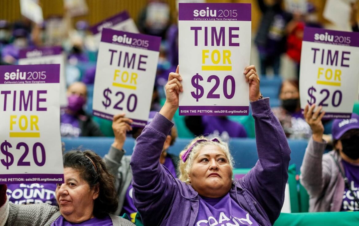 Protesters at a meeting of the Los Angeles County Board of Supervisors calling for increased pay.
