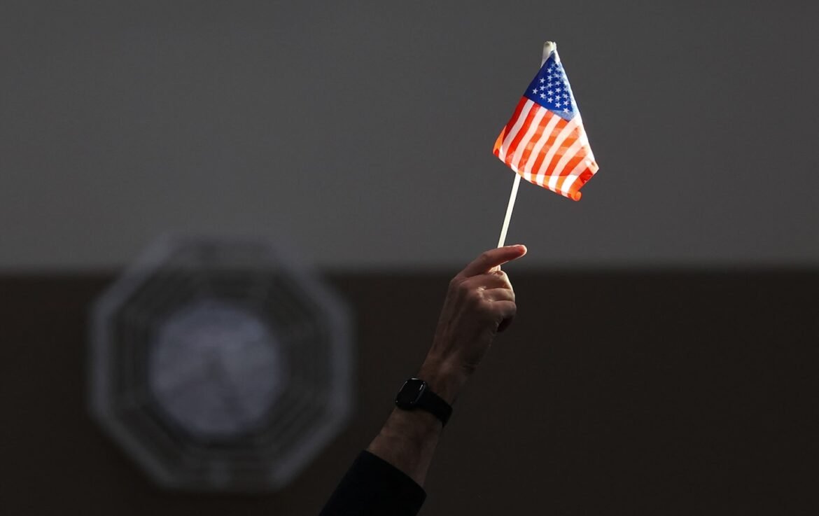An election worker raises a flag while assisting voters at a polling station Las Vegas, Nevada, on Election Day, November 5, 2024.