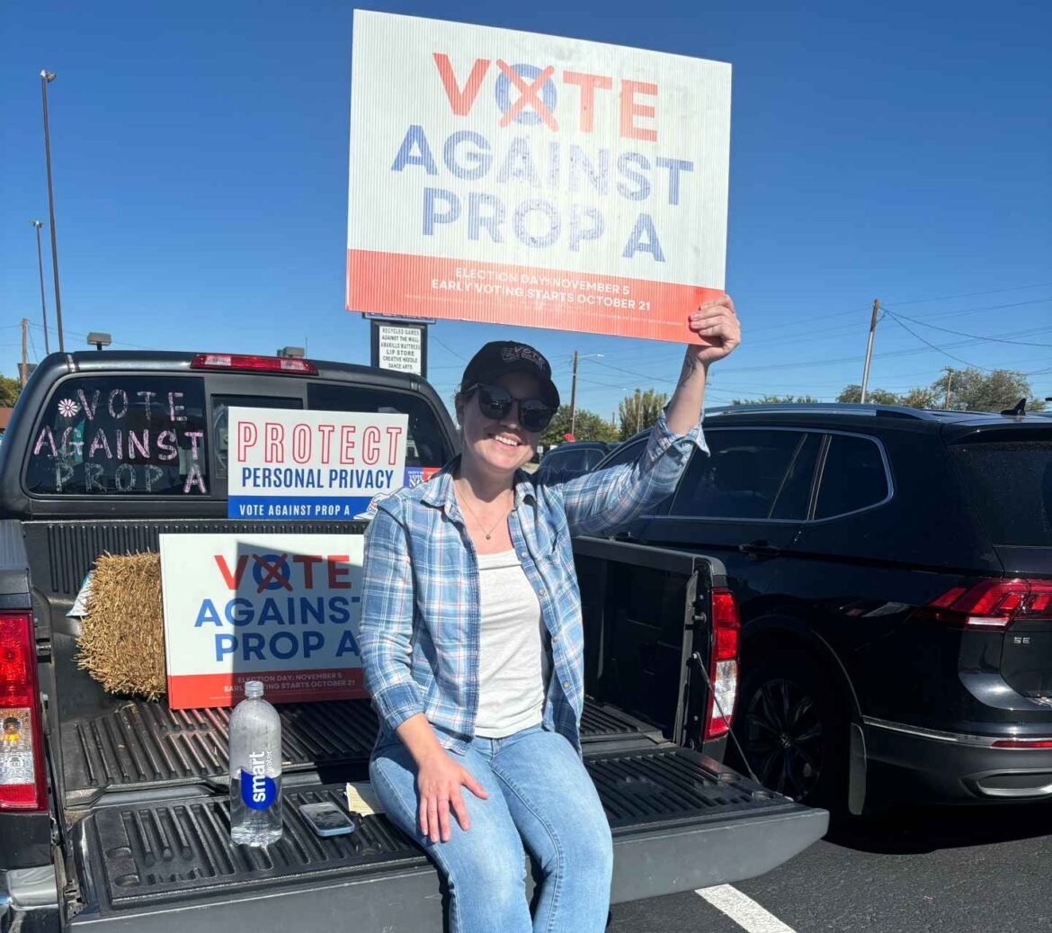 Abortion-rights activist Harper Metcalf hods up a sign reading "Vote Against Prop A" and "Protect Personal Privacy" while sitting in the bed of a truck.