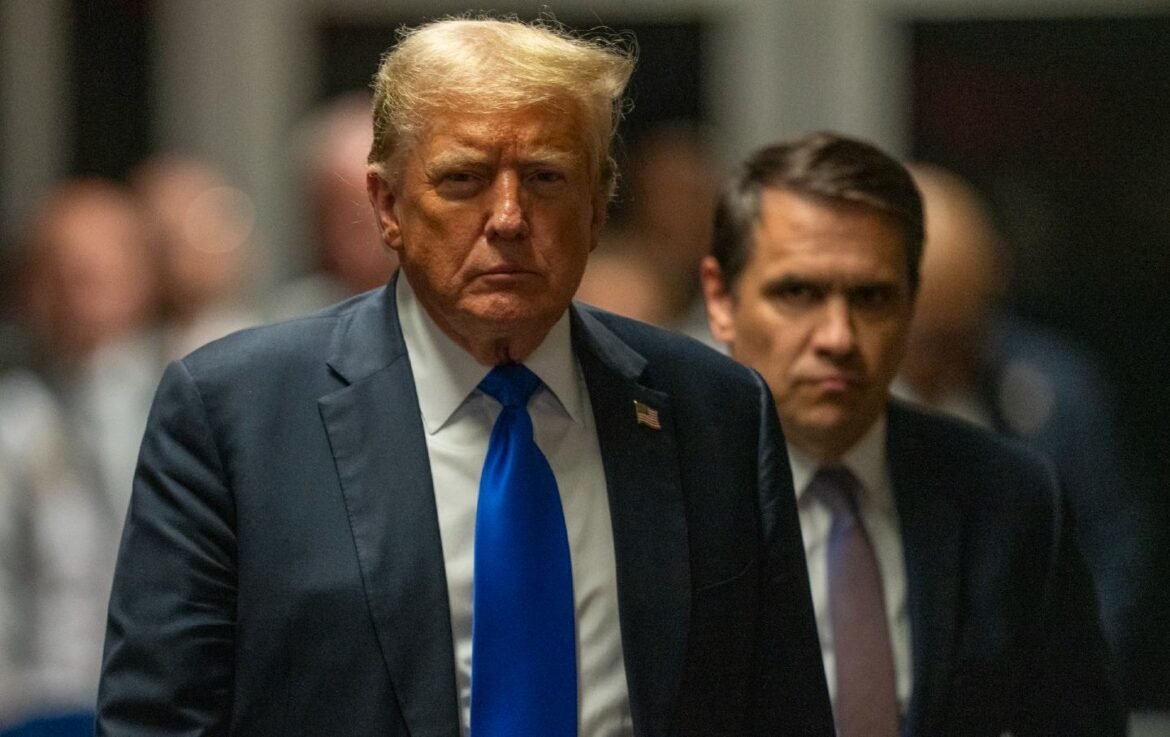 Donald Trump walks to go speak to the media after being found guilty following his hush-money trial in Manhattan on May 30.