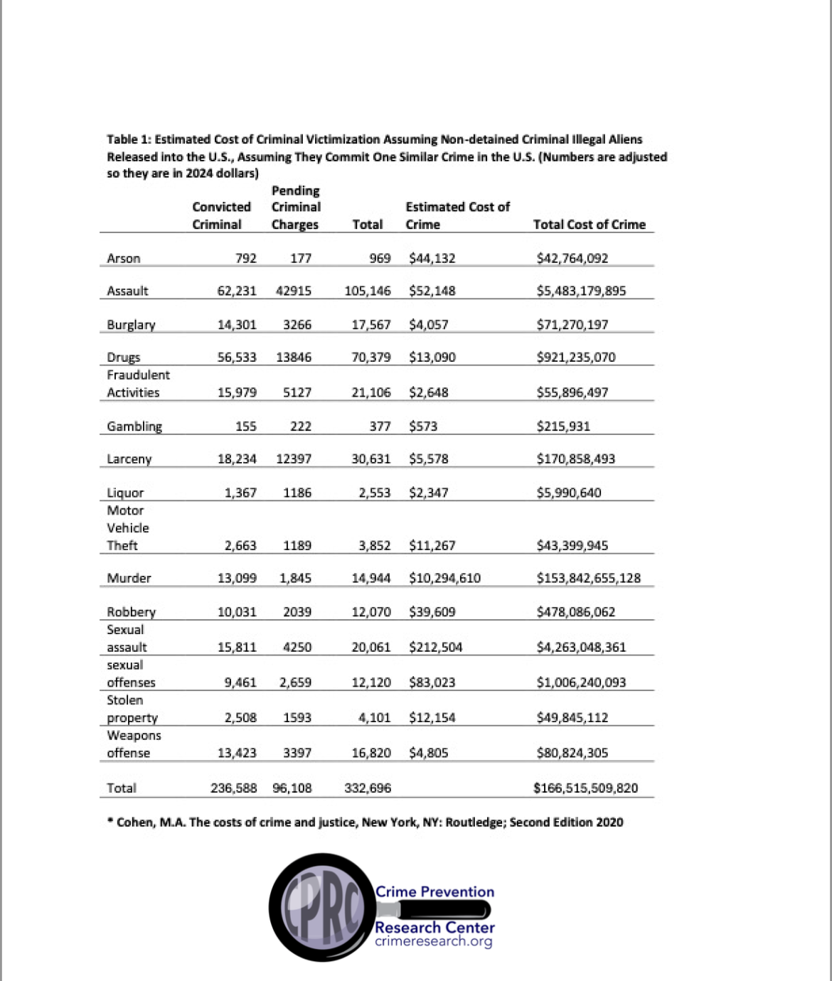We will shortly be releasing a Real Clear Investigations analysis based on estimates developed by the U.S. Department of Justice’s National Institute of Justice (NIJ) suggests that crime by illegal aliens who entered the U.S. by July 21, 2024, cost the country some $166.5 billion.