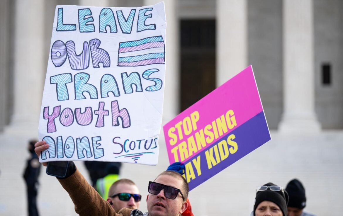 Activists for and against trans rights protest outside the Supreme Court Building before the start of the United States v. Skrmetti case on December 4, 2024.(Bill Clark / CQ-Roll Call, Inc via Getty Images)