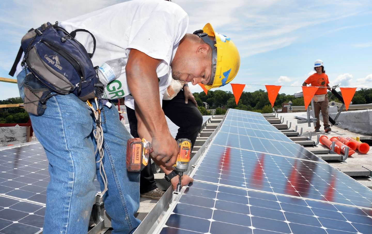 Shane Velez of the Bronx installs a solar electric system panel in Tory, New York, on August 7, 2015.
