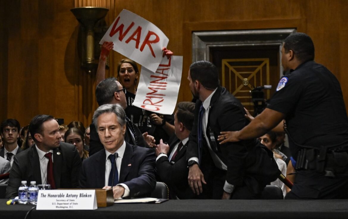 US Secretary of State Antony Blinken is repeatedly interrupted by pro-Palestinian demonstrators as he delivers testimony before the Senate Foreign Relations Committee on May 21, 2024.