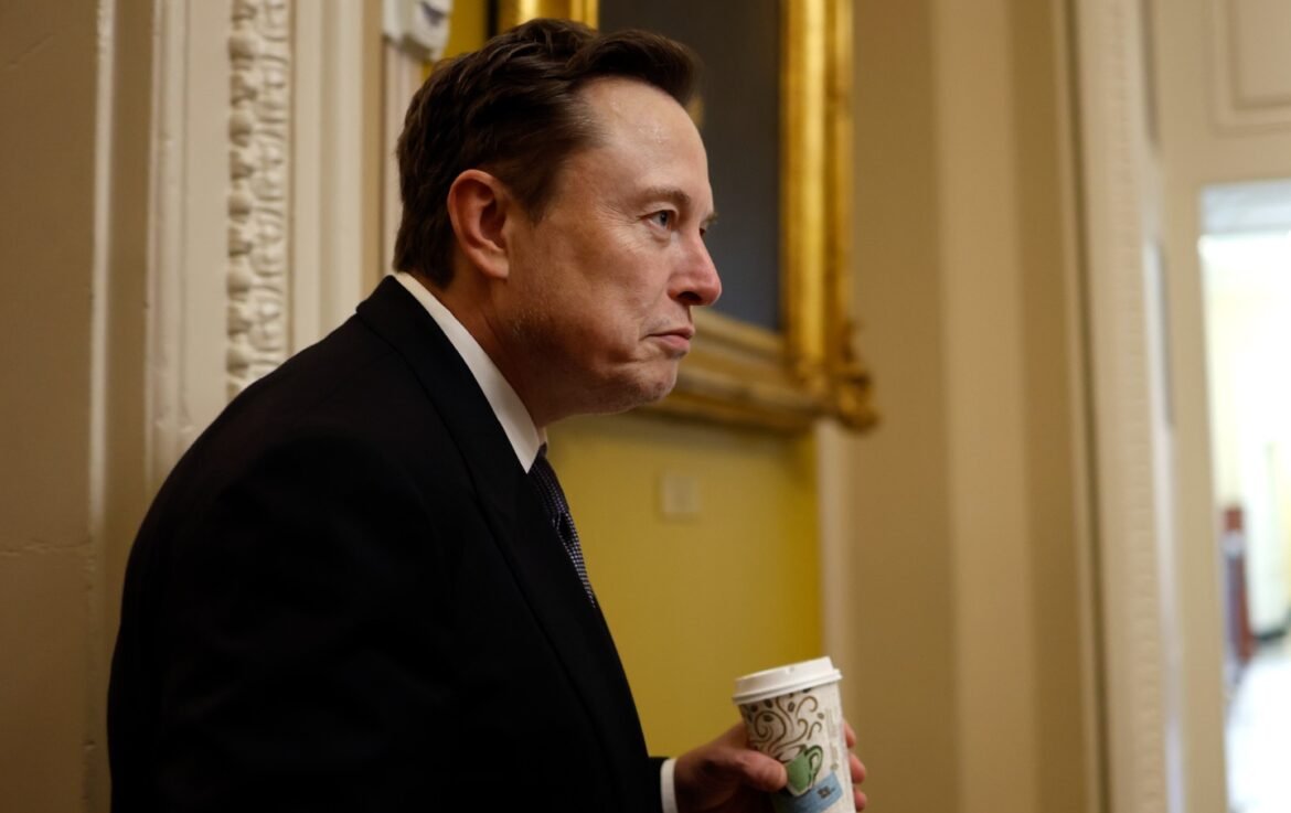 Elon Musk inside the Capitol Building, holding a cup of coffee and frowning.