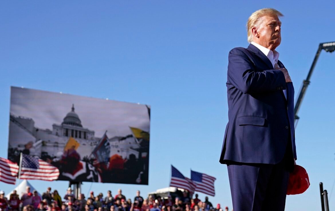 Donald Trump stands while a choir of men imprisoned for their role in the January 6 insurrection sing at a campaign rally at in Waco, Texas, in March 2023.