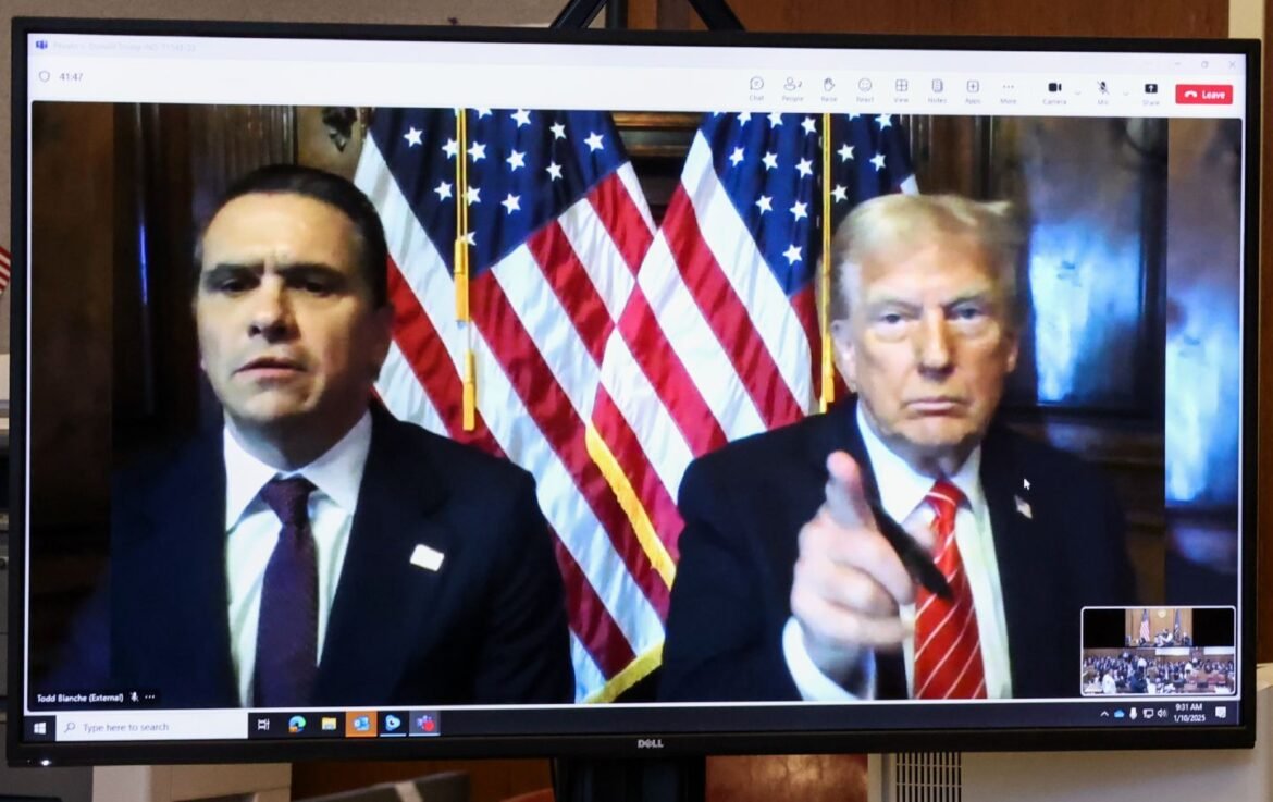 Donald Trump appears remotely for a sentencing hearing with his attorney Todd Blanche on January 10, 2025.(Brendan McDermid-Pool / Getty Images)