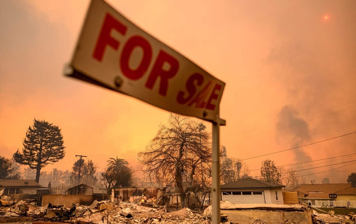 A for sale sign remains as homes smolder during the Eaton fire in the Altadena area of Los Angeles County, California on January 8, 2025.