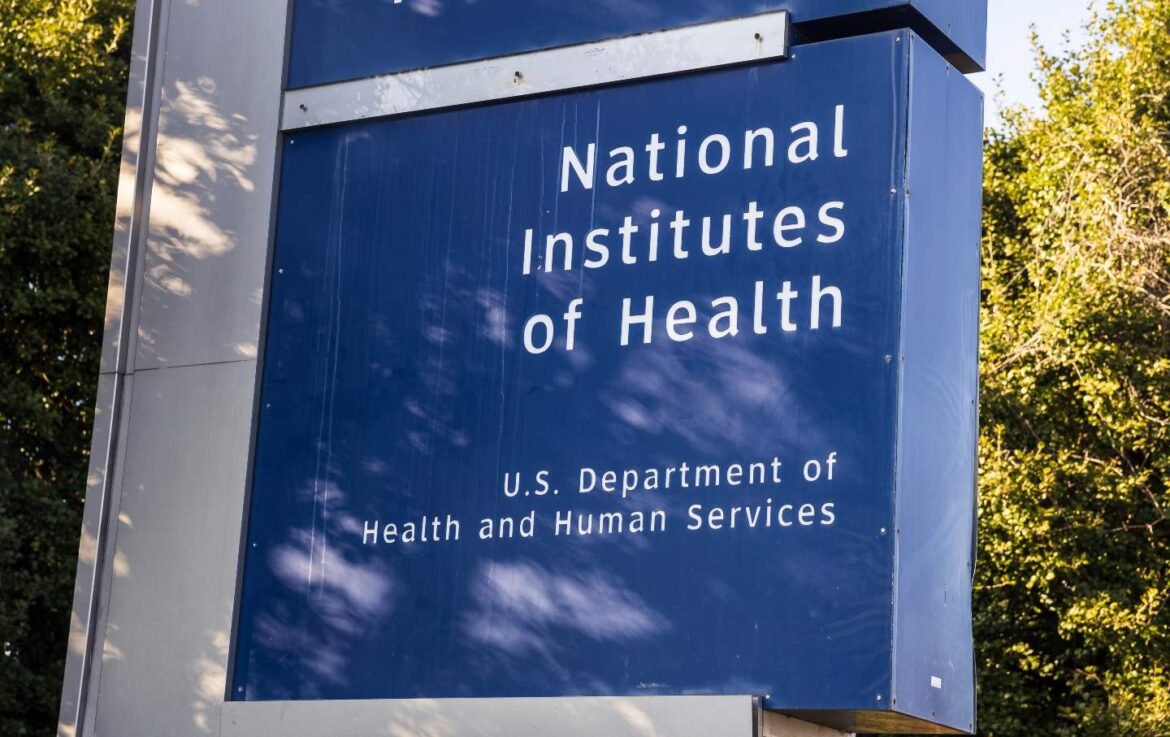 A sign is seen outside National Institutes of Health headquarters in Bethesda, Maryland.