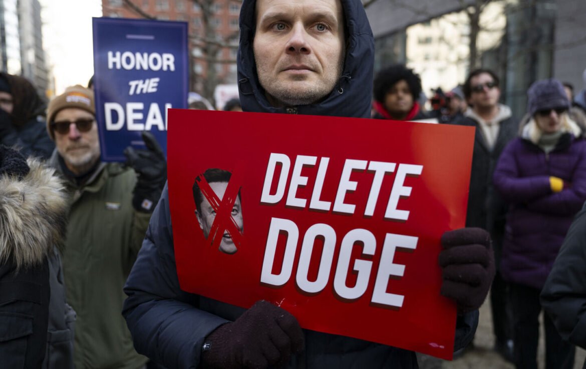 A protestor holds a sign during a rally against Donald Trump and Elon Musk’s Department of Government Efficiency (DOGE) in New York City on February 19.