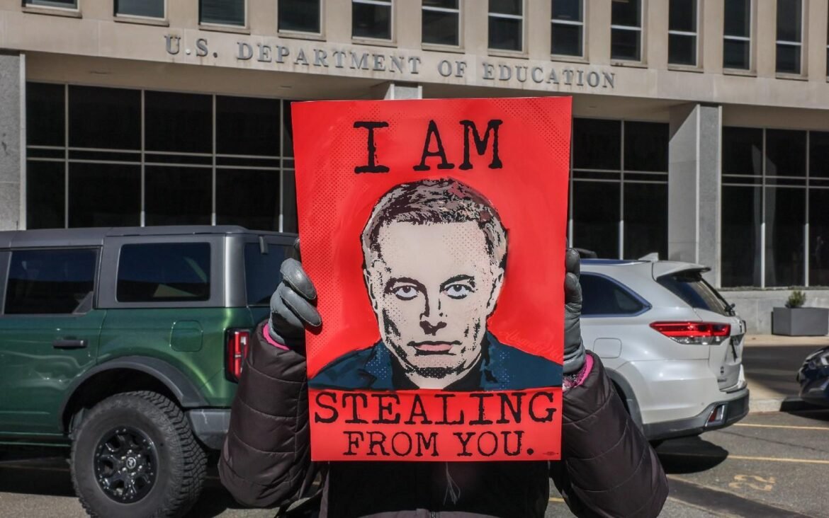 A protester holds a poster with an image of Elon Musk that reads “I Am Stealing From You” at the US Department of Education in Washington, DC, on February 14, 2025.(Jemal Countess / Getty Images for the Progressive Change Institute)