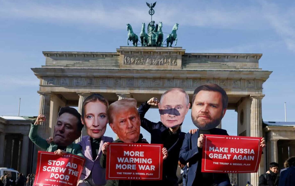 Activists wearing masks of (L-R) Tesla and SpaceX CEO Elon Musk, Co-leader and main candidate of the far-right Alternative for Germany (AfD) party Alice Weidel, US President Donald Trump, Russian President Vladimir Putin, and US Vice President JD Vance, hold up placards which read “Stop Aid, Screw the poor,” “More Warming More War,” and “Make Russia Great Again” as they stage a protest against the perceived support of the US and Russia for the far-right AfD party in front of the landmark Brandenburg Gate in Berlin, on February 20, 2025, ahead of the upcoming German elections on February 23.