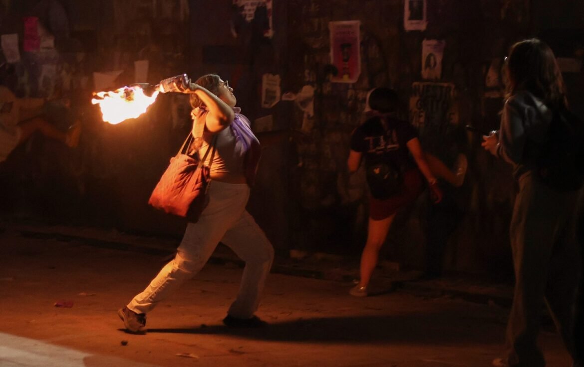 A demonstrator throw a molotov cocktail during a rally for the International Women’s Day in Mexico City on March 8, 2025.(Silvana Flores / AFP via Getty Images)
