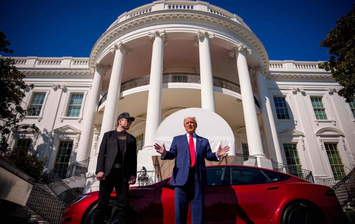 President Donald Trump, accompanied by White House Senior Advisor, Tesla and SpaceX CEO Elon Musk speaks next to a Tesla Model S on the South Lawn of the White House on March 11, 2025.