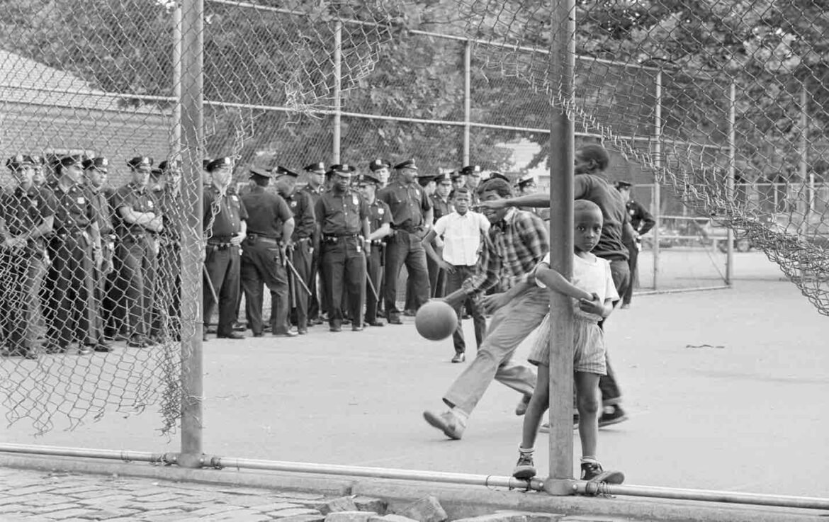 A young boy peers out from a hole in a fence as his friends play basketball in a court where police officers are gathering for a patrol in East New York, 1966.