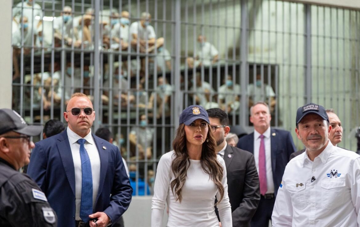 US Secretary of Homeland Security Kristi Noem tours the Terrorist Confinement Center (CECOT) in Tecoluca, El Salvador, on March 26, 2025.