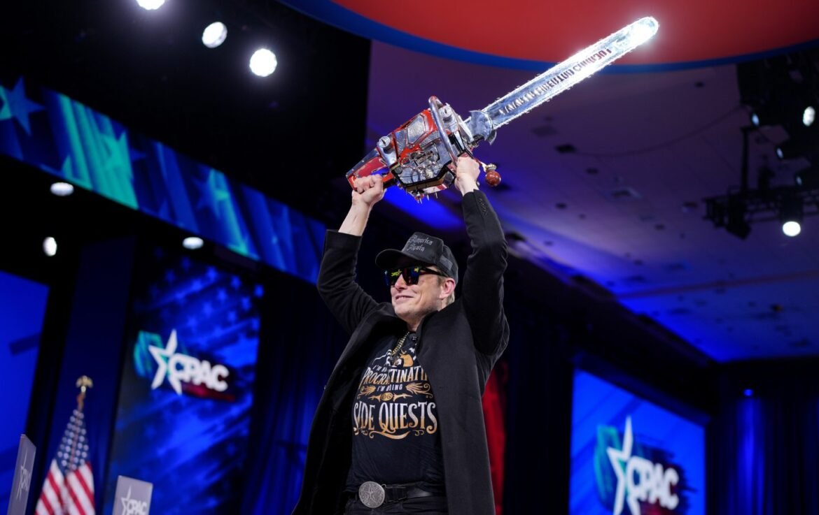 Elon Musk wields a chainsaw as he leaves the stage at the Conservative Political Action Conference (CPAC) on February 20, 2025.
