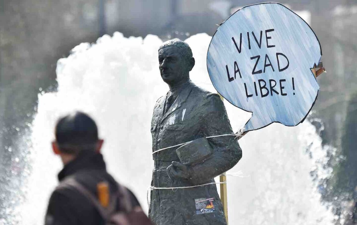 A man walks past a statue of Charles de Gaulle, with a cardboard speech bubble reading “LONG LIVE THE FREE ZAD” as hundreds of opponents to the Notre-Dame-des-Landes airport and ZAD activists gather to demand a collective management of the land planned for the airport’s construction, 2018.
