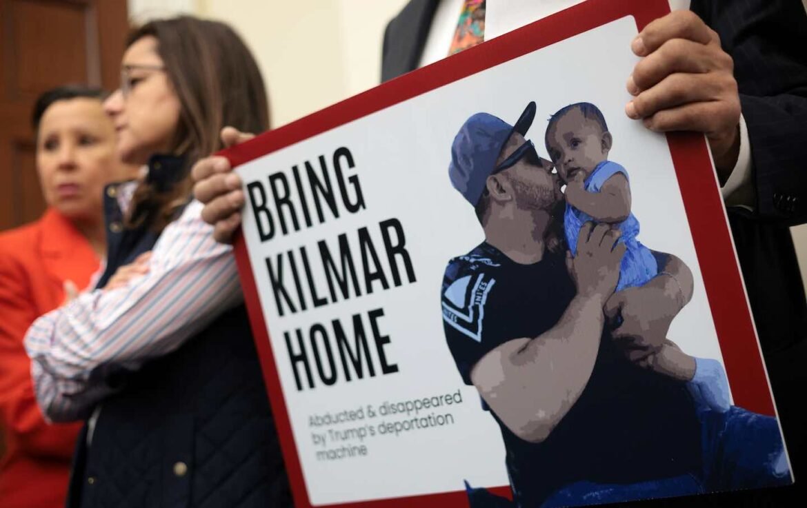 A member of the Congressional Hispanic Caucus holds a picture of Kilmar Abrego Garcia during a news conference to discuss Abrego Garcia’s arrest and deportation d at Cannon House Office Building on April 9, 2025 in Washington, DC.