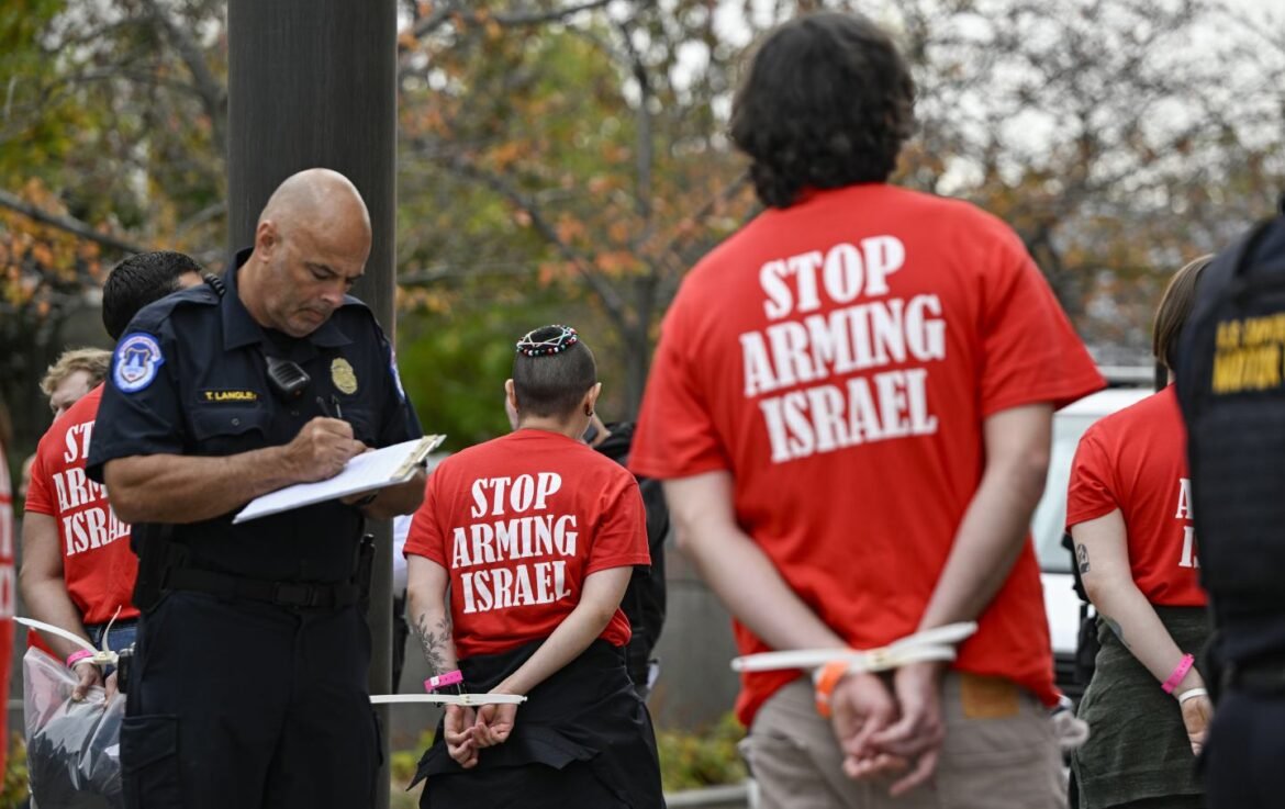 Police detain protesters wearing shirts with the slogan “Stop Arming Israel” during a Pro-Palestinian demonstration in Washington, D.C., on November 19, 2024.