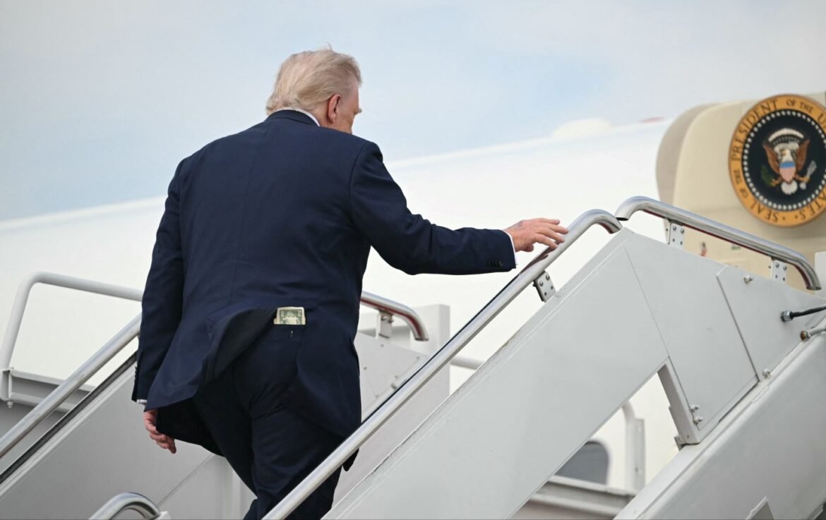 A $50 bill is seen in US President Donald Trump’s back pocket as he boards Air Force One prior to departing from Joint Base Andrews in Maryland, on May 1, 2025.