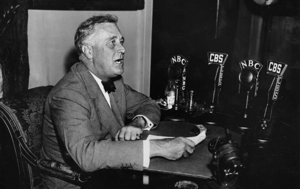 American President Franklin Delano Roosevelt (1882 – 1945) sits at a desk in front of a series of microphones (two labelled NBC and two CBS) as he delivers a ‘Fireside Chat’ radio broadcast, 1930s.