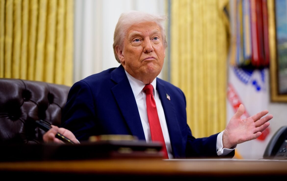 Donald Trump gestures while speaking during an executive order signing event in the Oval Office of the White House.