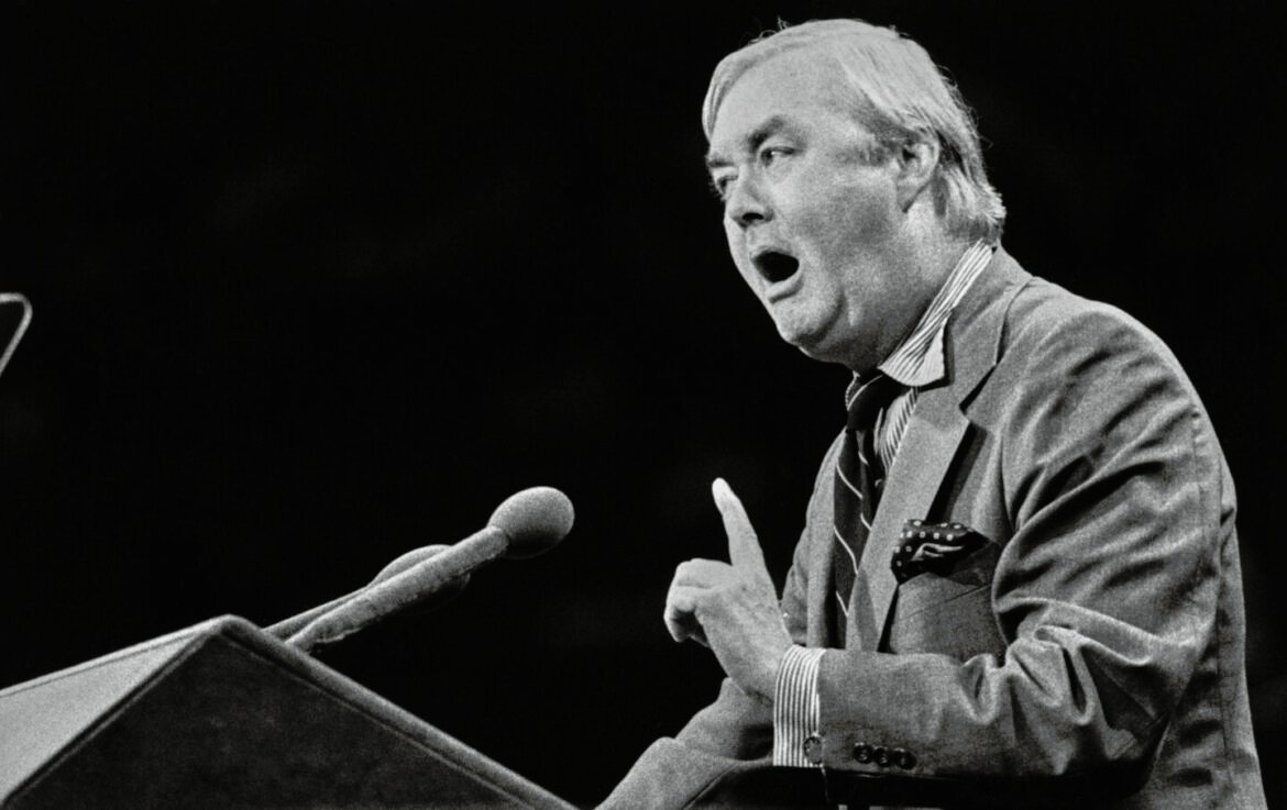 American politician and diplomat Daniel Patrick Moynihan delivers a speech, United States, circa 1980.