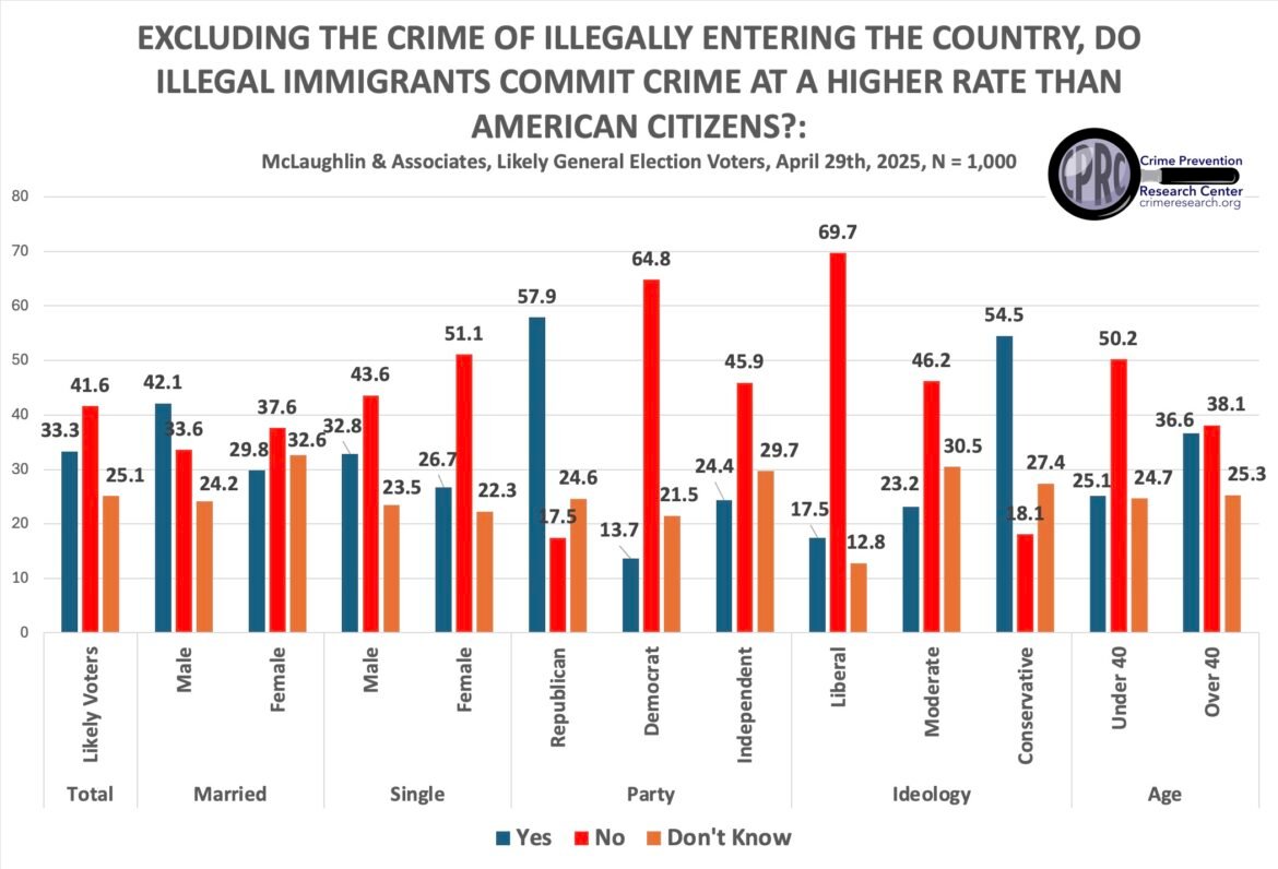 The CPRC hired McLaughlin & Associates to survey 1,000 general election voters on April 29th, 2025, regarding whether people think illegal aliens are committing crime at a higher rate than Americans. Despite all the evidence to the contrary, by a 41.6%-to-33.3%, likely voters disagree that illegals are more likely to commit crime. Men, Republicans, conservatives, whites, and those between 41 and 55 years of age are the only ones who believe that illegal aliens are more likely to commit crime than Americans. Hispanics are more than twice as likely as blacks to believe that illegals commit more crime than Americans. Young people (18 to 29) are also much more likely to believe illegal aliens aren’t committed crime.
