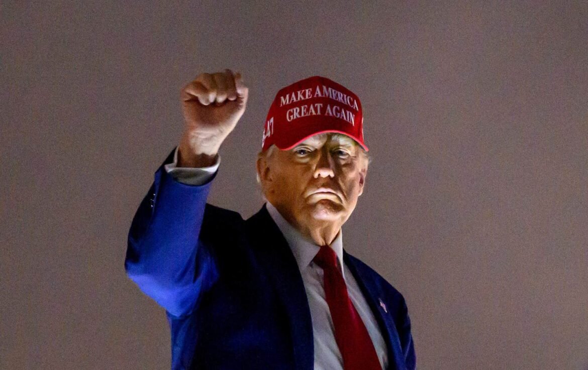 President Donald Trump pumps his fist as he boards Air Force One before departing Miami International Airport, in Miami, Florida, on April 3, 2025.