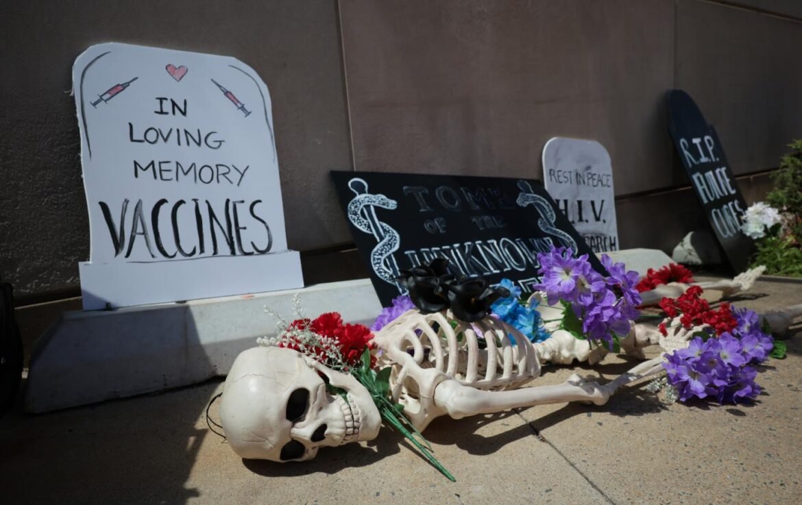 A memorial for the loss of funding for research and public health programs is placed in front of the National Institutes of Health on May 10, 2025.