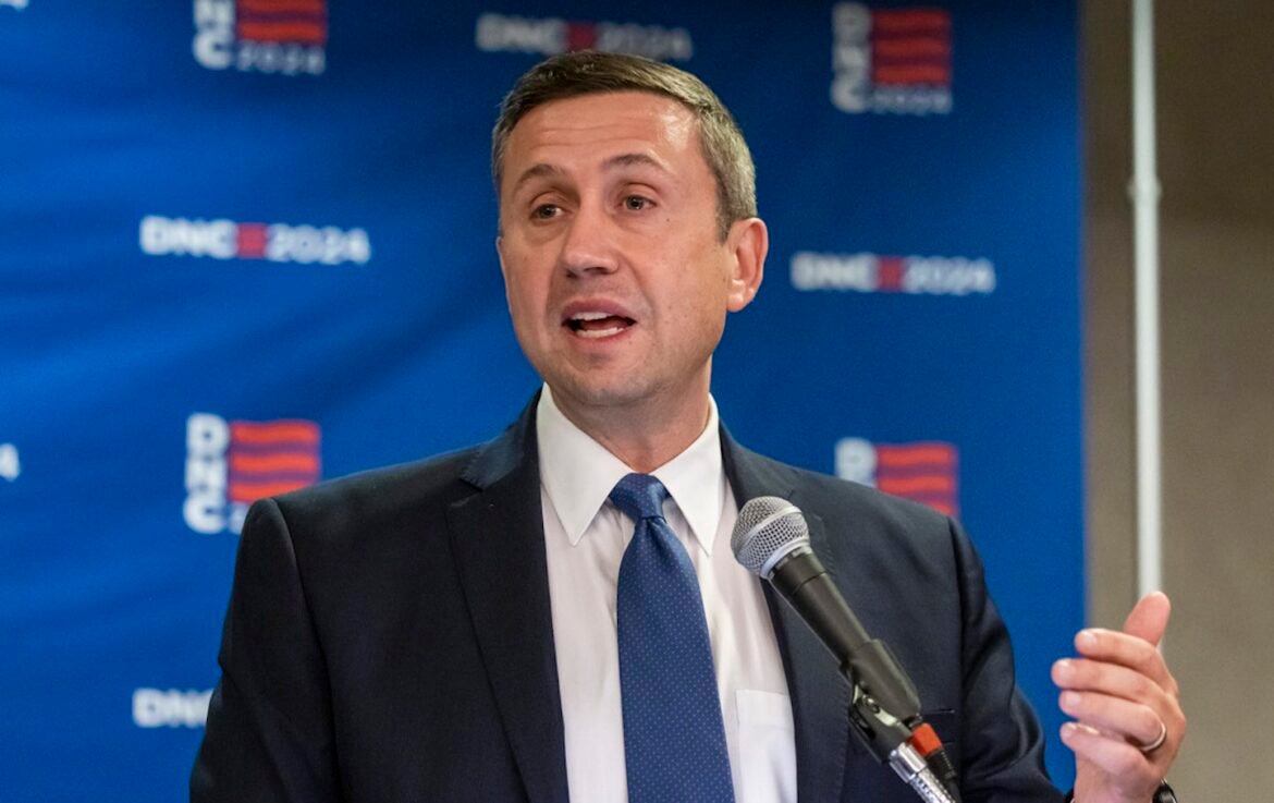 Ken Martin, chair of the DNC, speaks to reporters during a press conference.