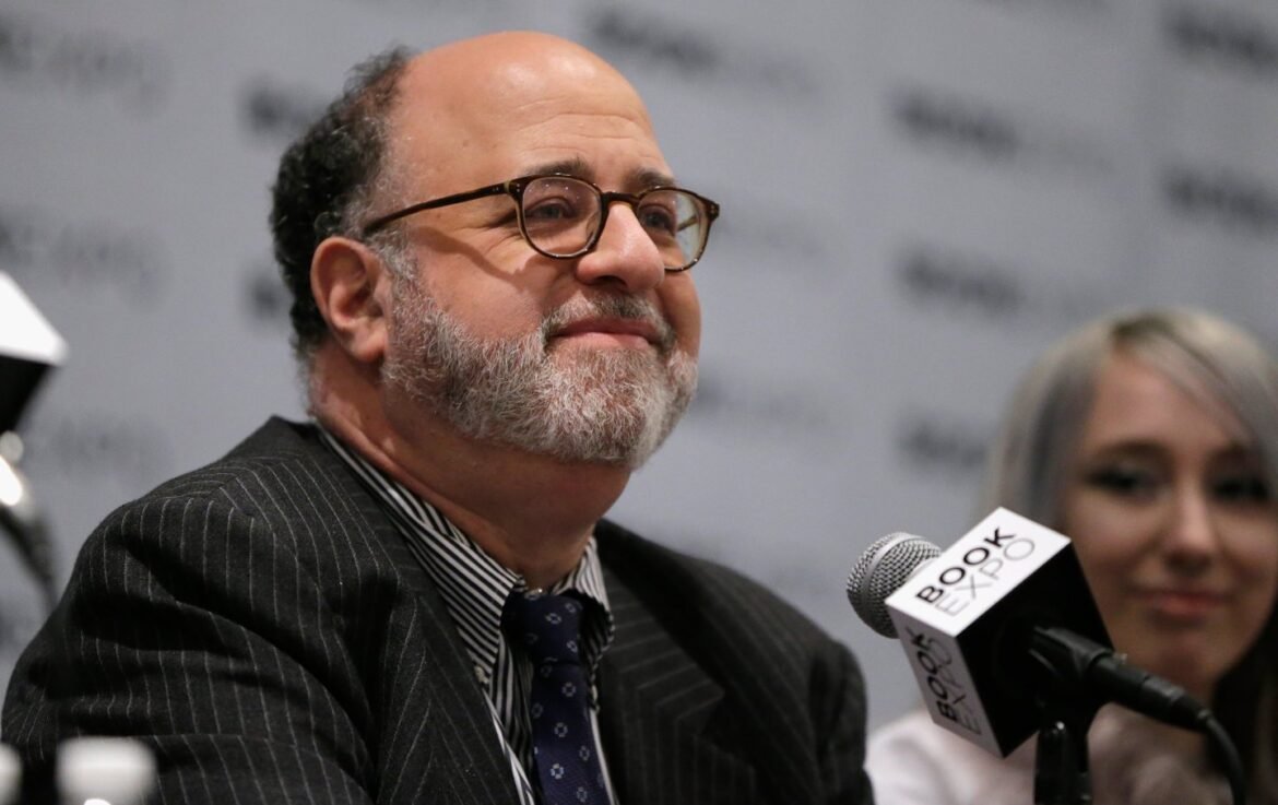Commentary editor John Podhoretz sits in front of a microphone with “Book Expo” written on it.