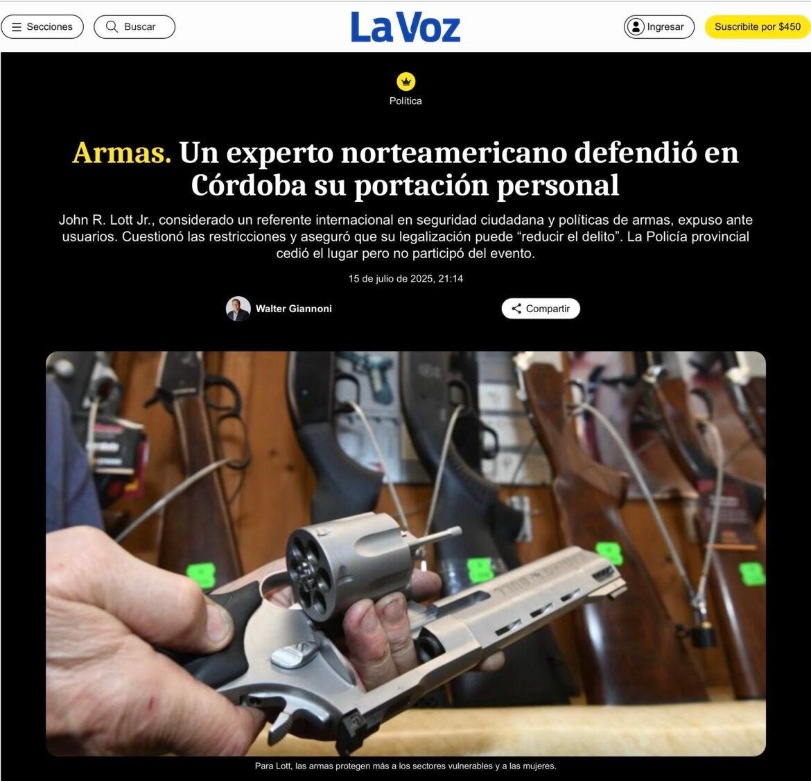 Un debate sobre la controversia inminente: El viernes pasado, Córdoba acogió una conferencia de John R. Lott Jr., economista estadounidense y referente mundial en políticas de armas, quien se dirigió a un público local convocado por la Asociación de Propietarios Legítimos de Armas de la Provincia de Córdoba.