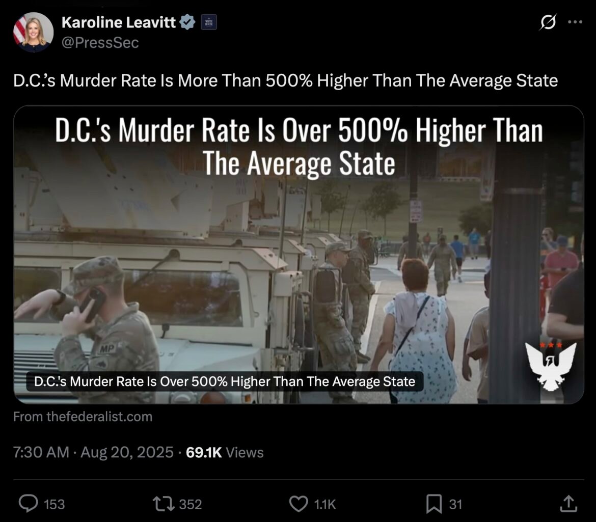 White House Press Secretary Karoline Leavitt again Tweets out our new op-ed piece at The Federalist titled: “D.C.’s Murder Rate Is More Than 500% Higher Than The Average State.”