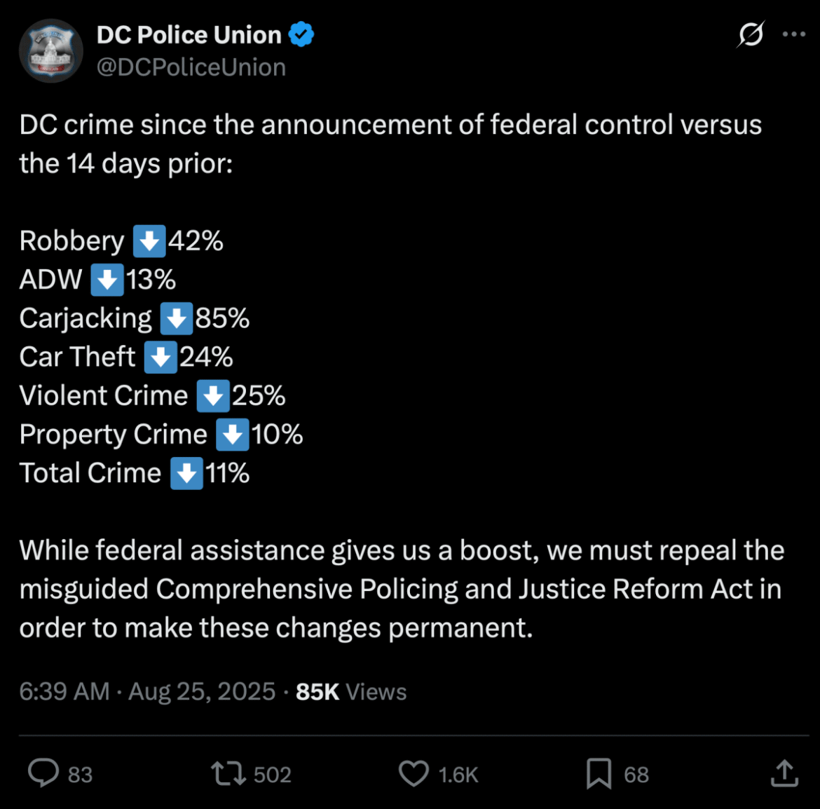 Who would have thought it? Adding more police to the streets, reducing restrictions on policing, and targeting illegal aliens do cut crime. The D.C. police union reports that crime fell sharply during the 14 days after President Trump announced the federalization of law enforcement in D.C., compared to the 14 days before. This Tweet by the police officers’ union was posted at 6:39 AM ET, August 25, 2025.