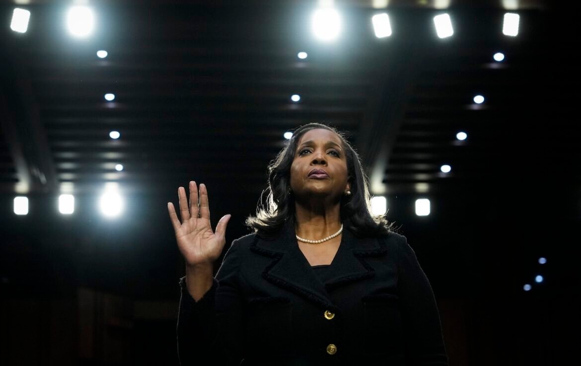 Lisa Cook is sworn in during a Senate Banking nominations hearing on June 21, 2023, in Washington, DC.