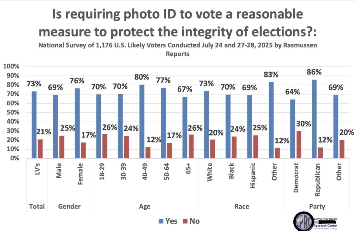 Voters continue to favor requiring photo ID to vote—with support virtually unchanged from 2021. It is a key election integrity measure that President Donald Trump has openly championed—by more than a 3-to-1 margin. In recent surveys, 73% of likely U.S. voters say this requirement is reasonable to protect election integrity, while 21% disagree. Moreover, strong majorities across the political spectrum—86% of Republicans, 64% of Democrats, and 69% of independent voters—believe that voter ID requirements help ensure election integrity. Despite the concerns that voter photo IDs discriminate against minorities and the poor, 70% of blacks and 69% of Hispanics and 77% of those making under $30,000 support voter IDs. By contrast, those making over $200,000 have the costs level of support at 58%.
