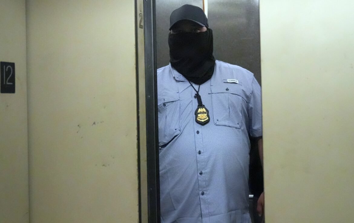 A masked ICE agent stalks the corridors on the 12th floor of Lower Manhattan’s immigration court at 26 Federal Plaza, New York City on September 8, 2025.