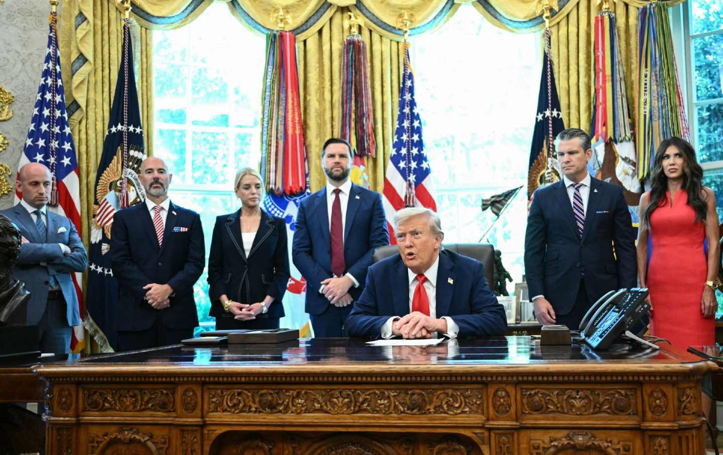 President Donald Trump speaks to the press before signing an executive order that aims to end cashless bail, in the Oval Office of the White House in Washington, DC, on August 25, 2025. Also pictured, from left to right, Deputy Chief of Staff Stephen Miller, Administrator Drug Enforcement Administration Terry Cole, US Attorney General Pam Bondi, Vice President JD Vance, Defense Secretary Pete Hegseth, and Secretary of Homeland Security Kristi Noem.